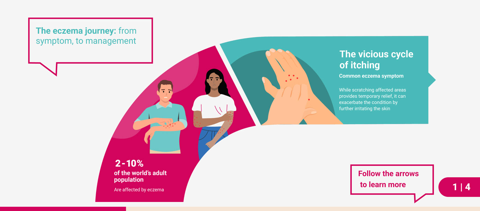 An eczema journey can be made up of winding roads, wrong turns and roundabouts. Choices at each of these steps could take a person living with eczema closer to better management of their condition. Explore the infographic below to see what a path from symptom to management could look like.